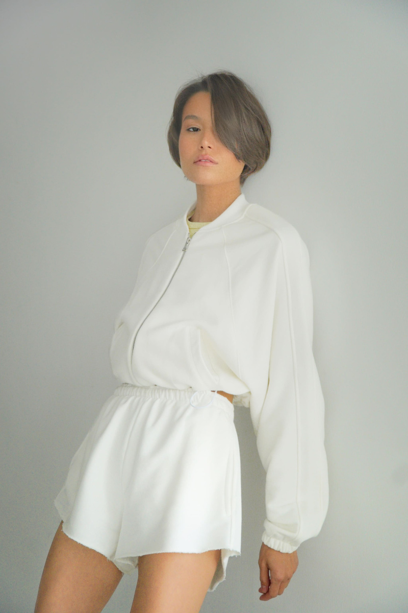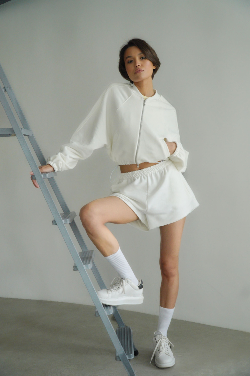Укороченные шорты на высокой посадке из футера трехнитки с велюровым эффектом с отстроченной резинкой и шнурком, с карманами в боковых швах, с декоративной отстрочкой швов сбоку и необработанным краем.