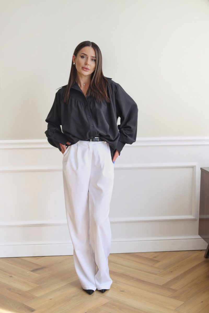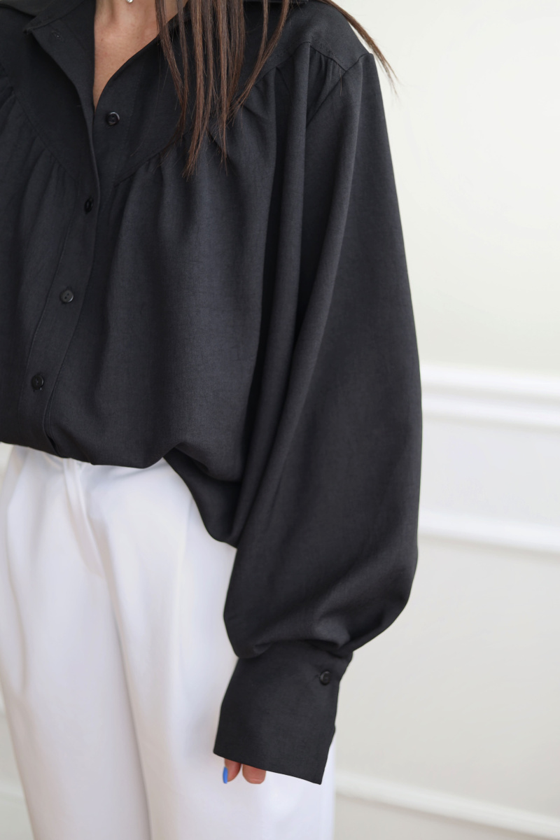 Классическая удлиненная рубашка из искусственного льна с кокеткой по спинке, воротником-стойкой, широкими манжетами, а также сборкой по линии груди и спинки. Ткань практически не мнется, быстро сохнет, не выгорает на солнце.