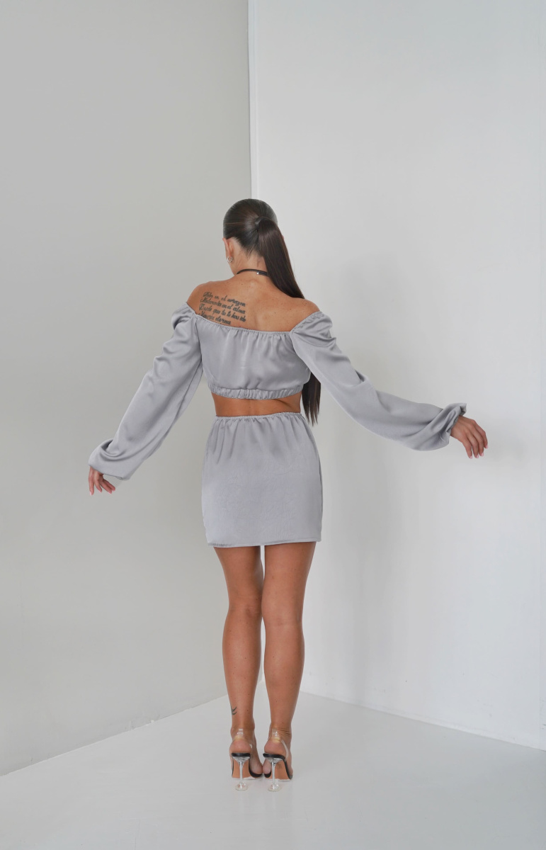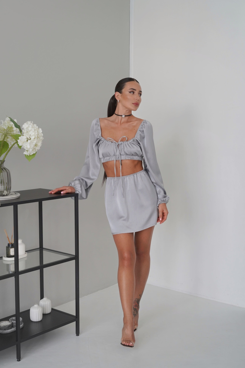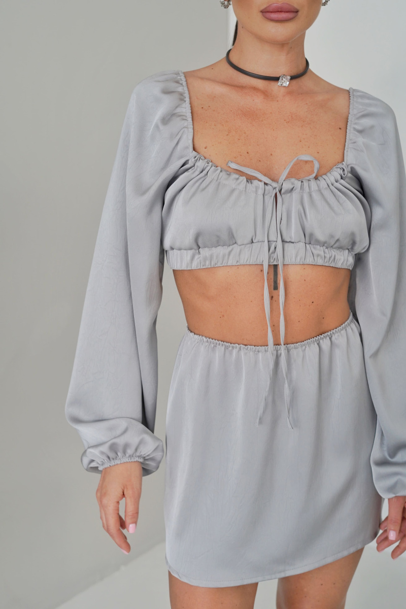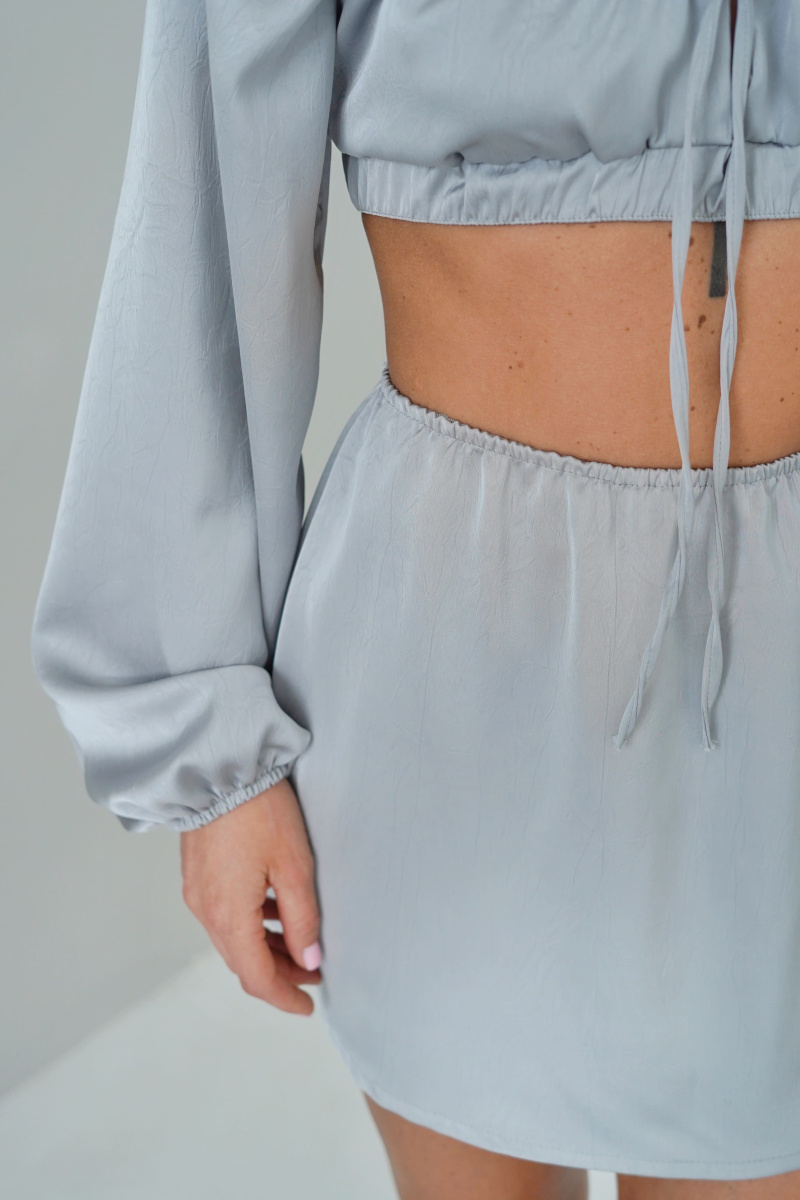 Юбка прямого кроя из жатой ткани на тонкой резинке в длине мини.