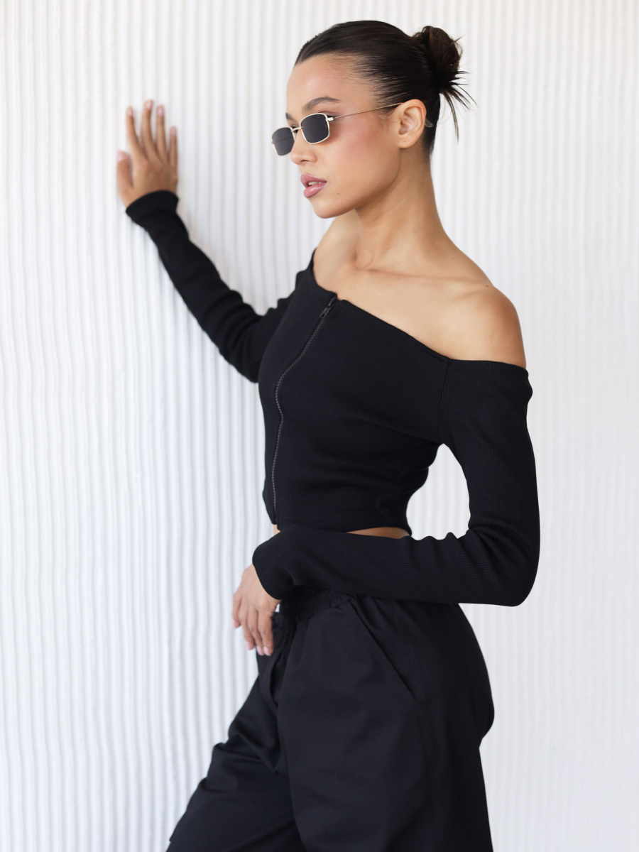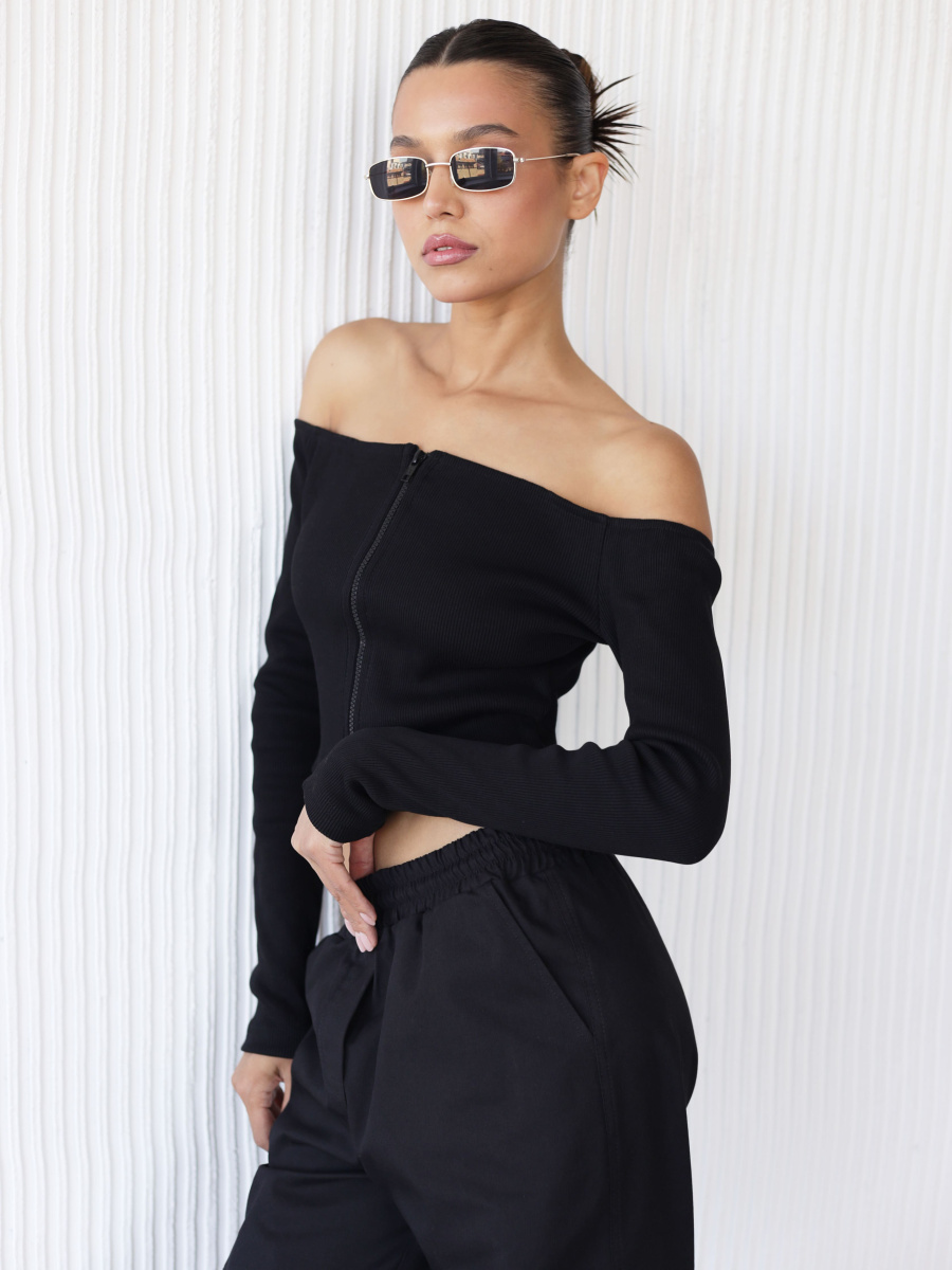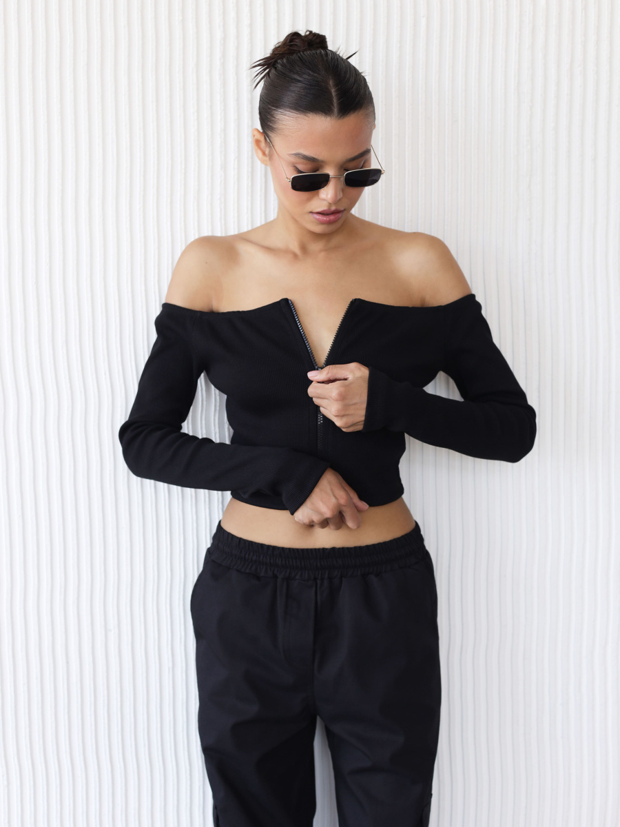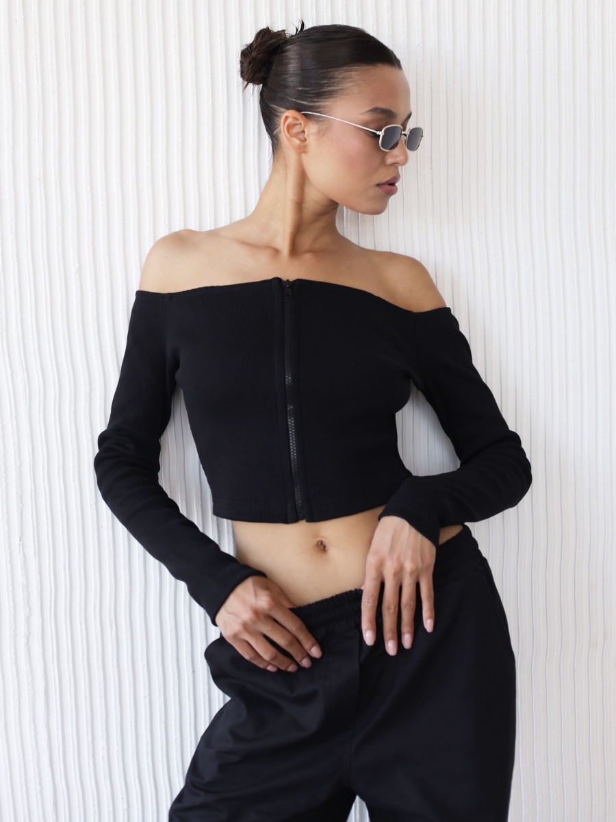 Укороченный лонгслив из плотного кашкорсе со спущенными плечами с пластиковой фурнитурой.