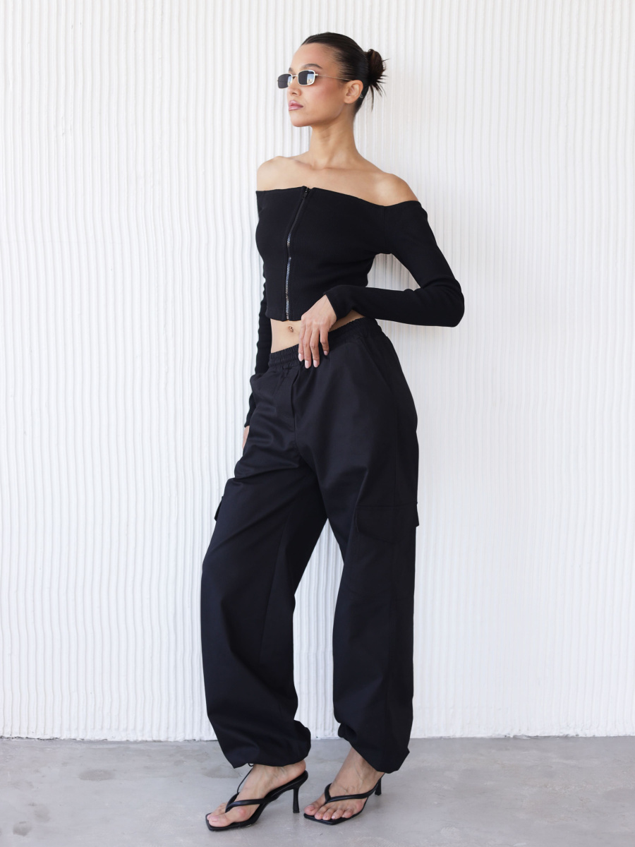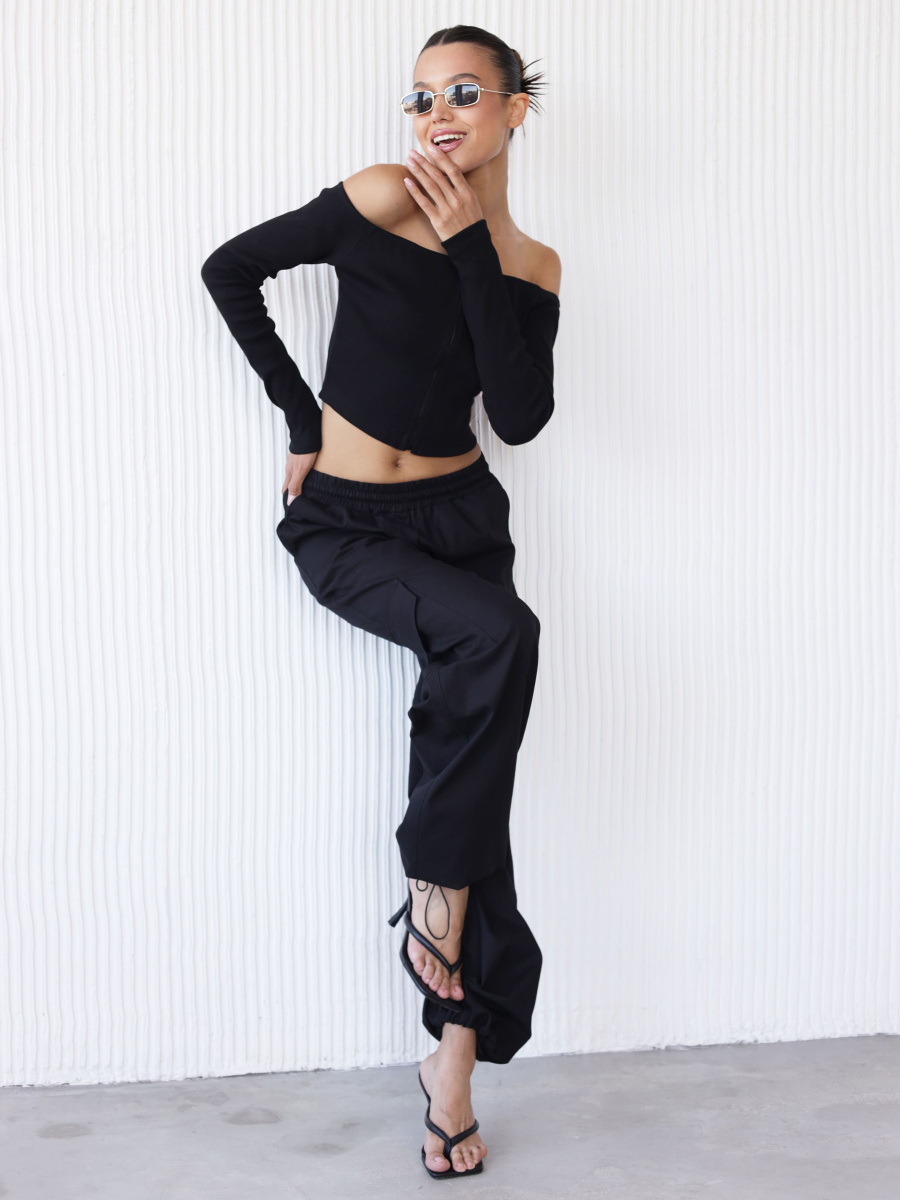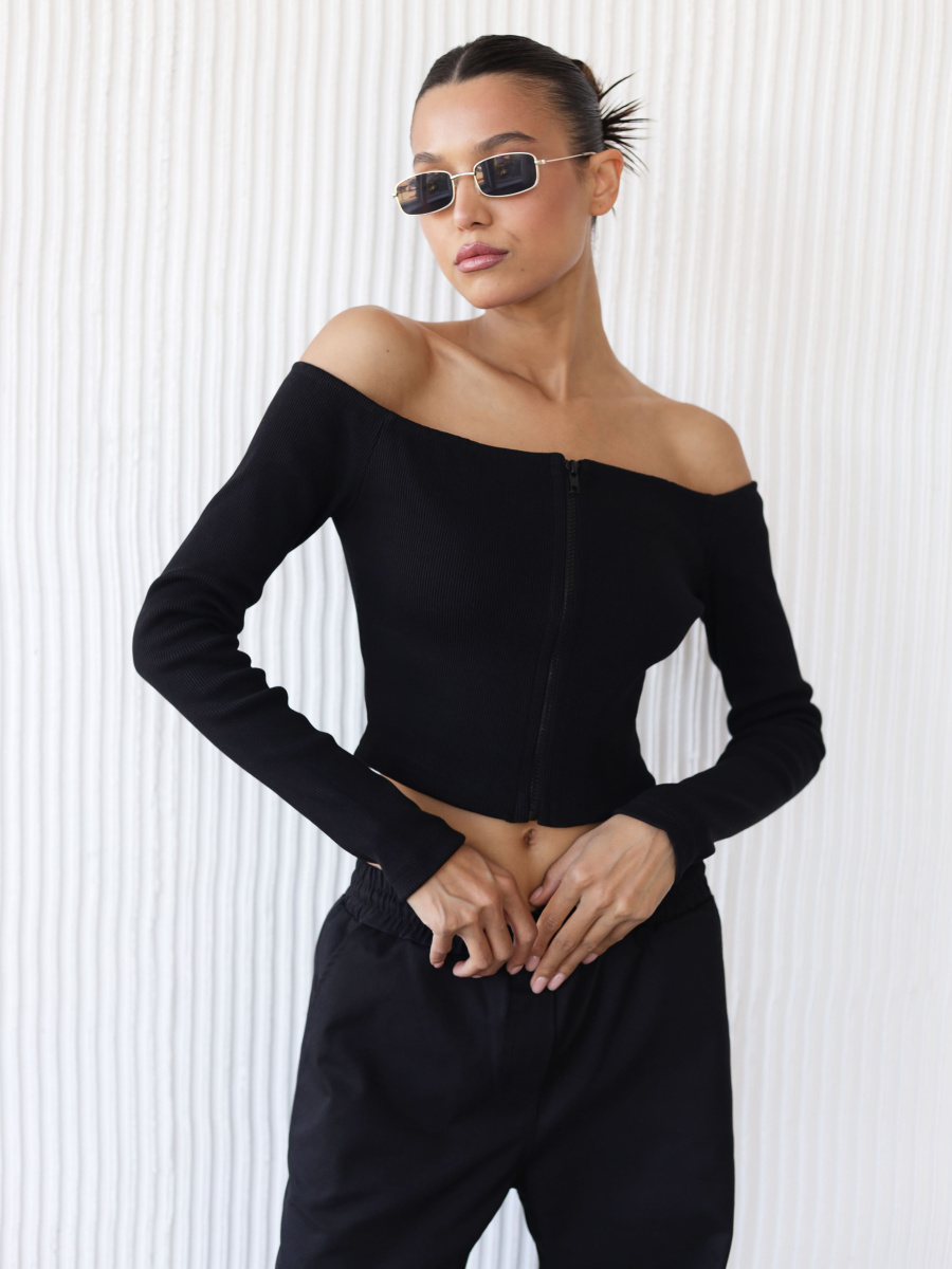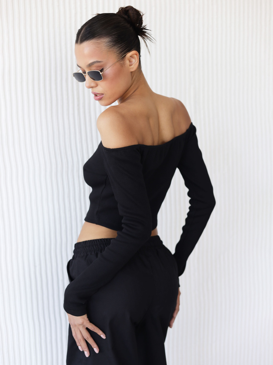 Укороченный лонгслив из плотного кашкорсе со спущенными плечами с пластиковой фурнитурой.