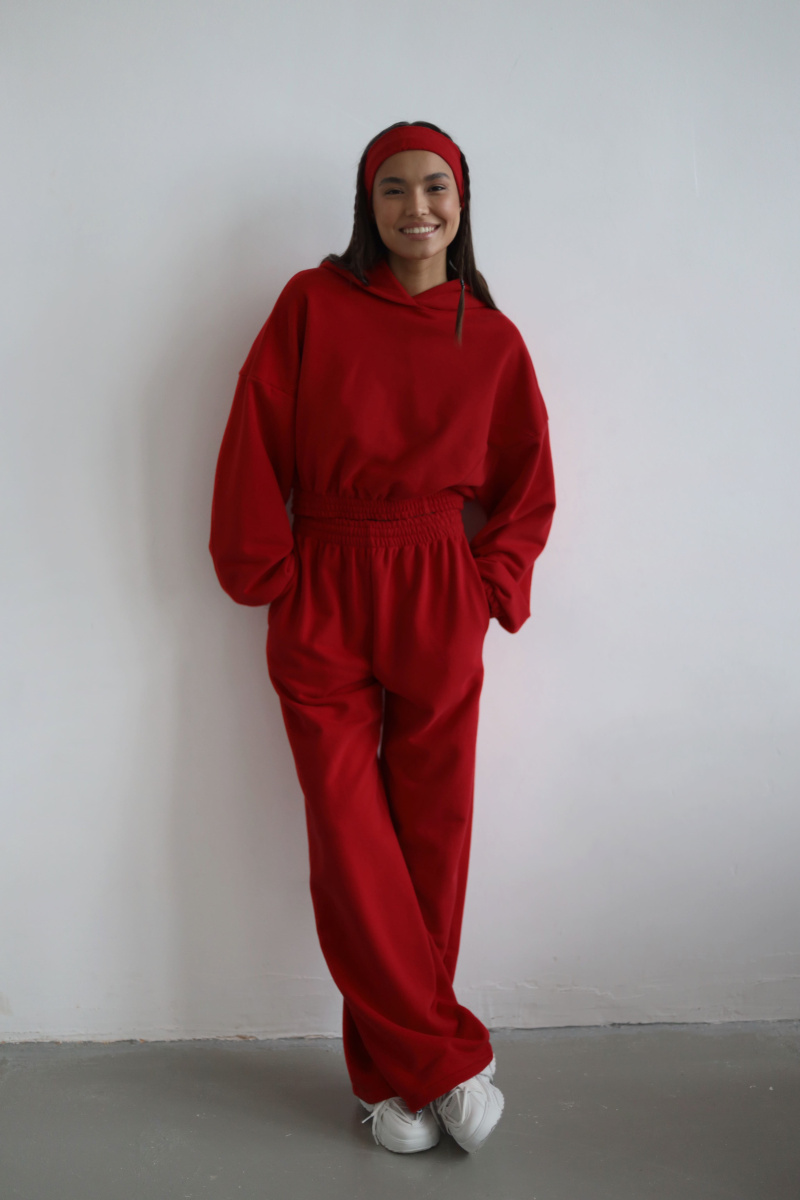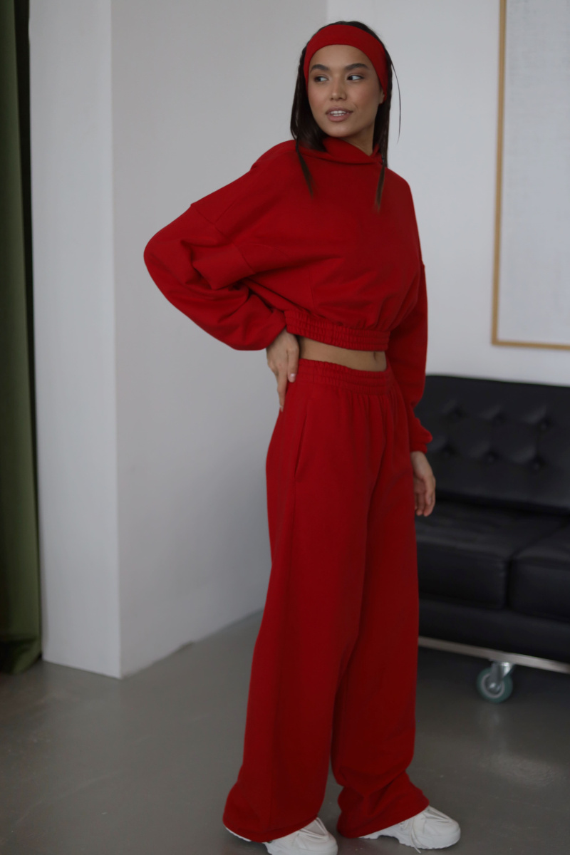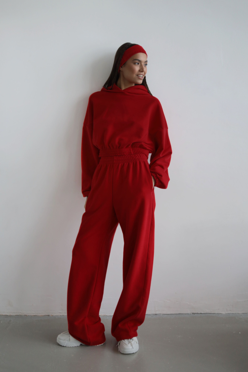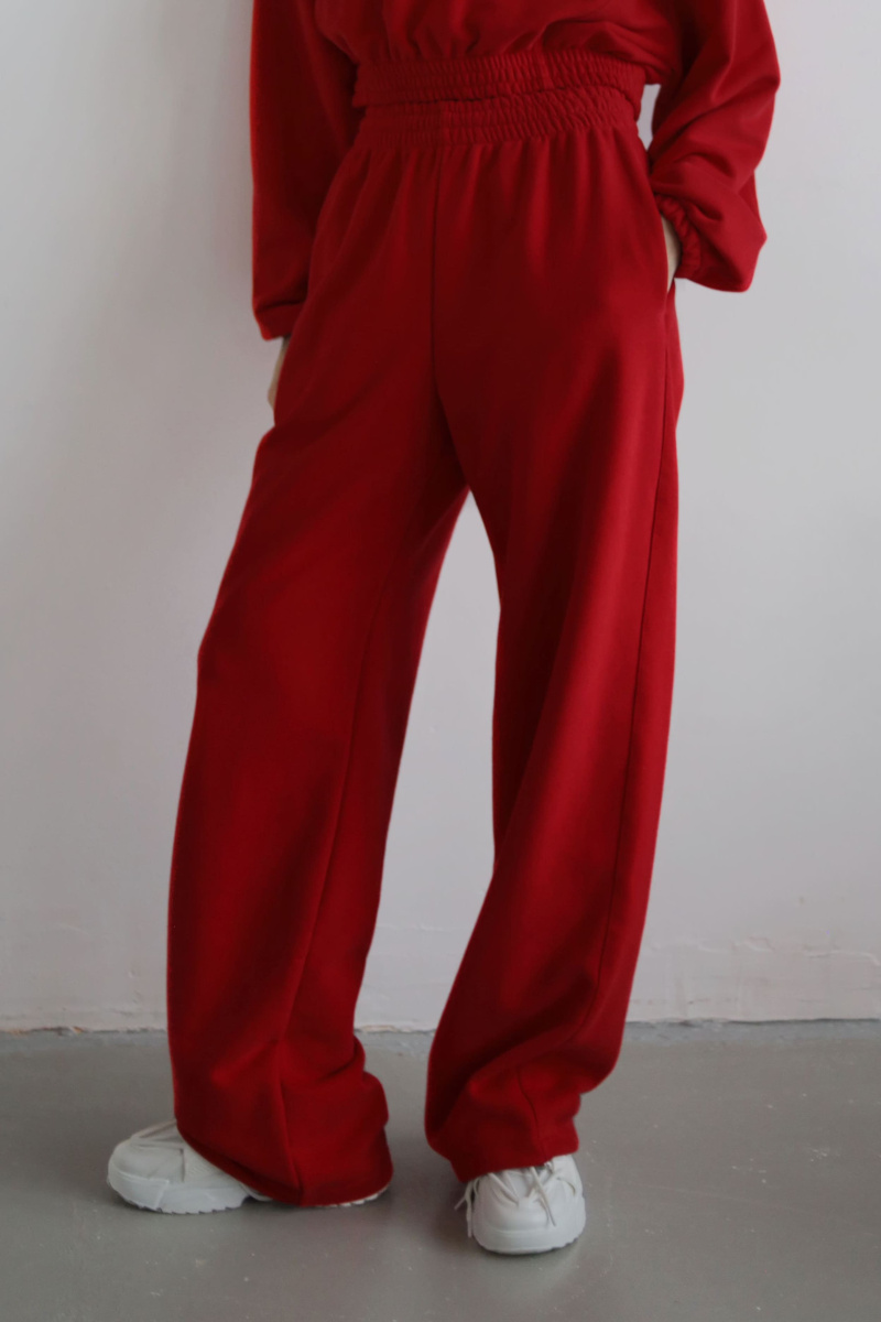 Брюки палаццо из футера трехнитки с велюровым эффектом с отстроченной резинкой и шнурком на высокой посадке, карманами в боковых швах. Затянув по низу кулиски из данной модели получаются джоггеры.