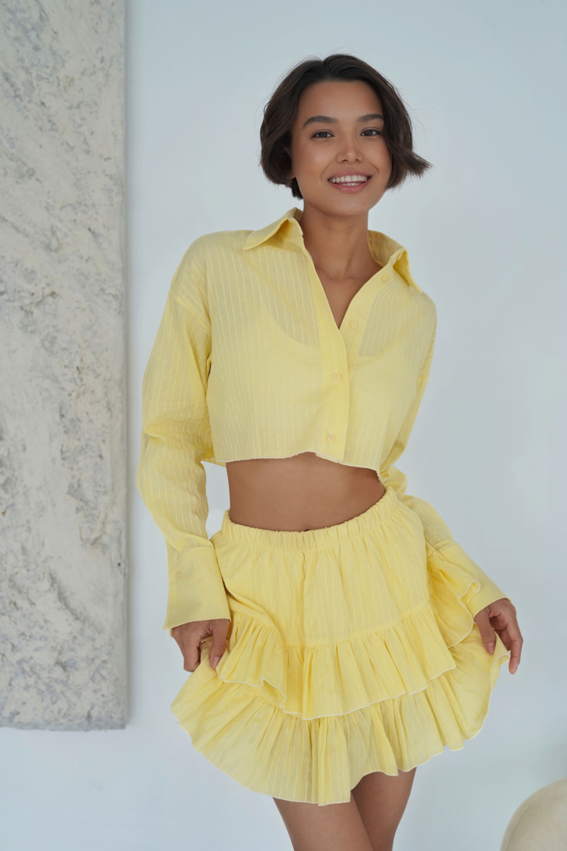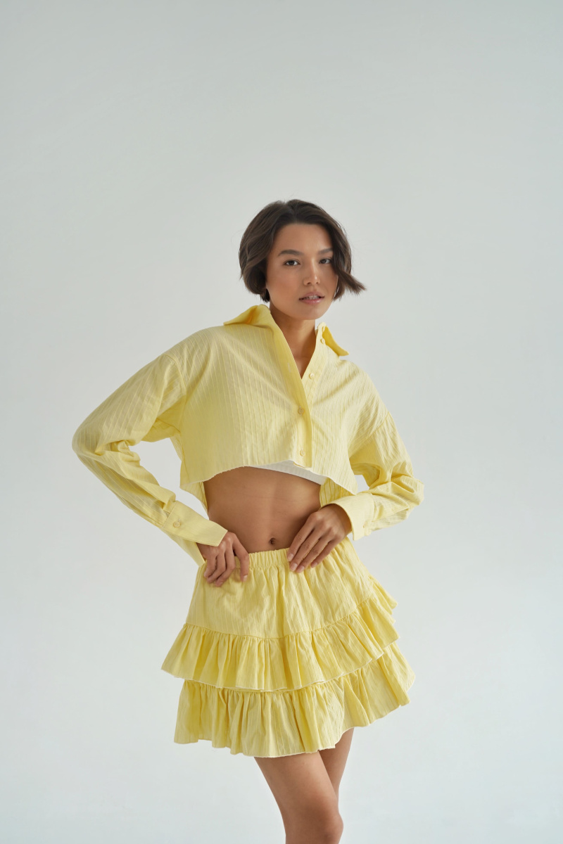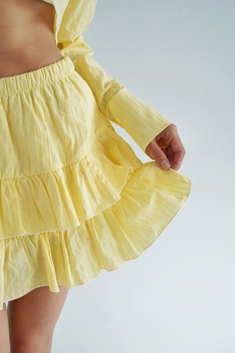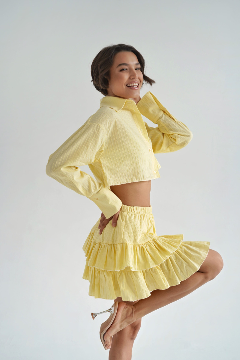 Юбка-шорты в длине мини на высокой посадке с отстроченной резинкой, выполнена из нескольких слоев фактурной ткани в полоску с рюшами, что придает пышности.