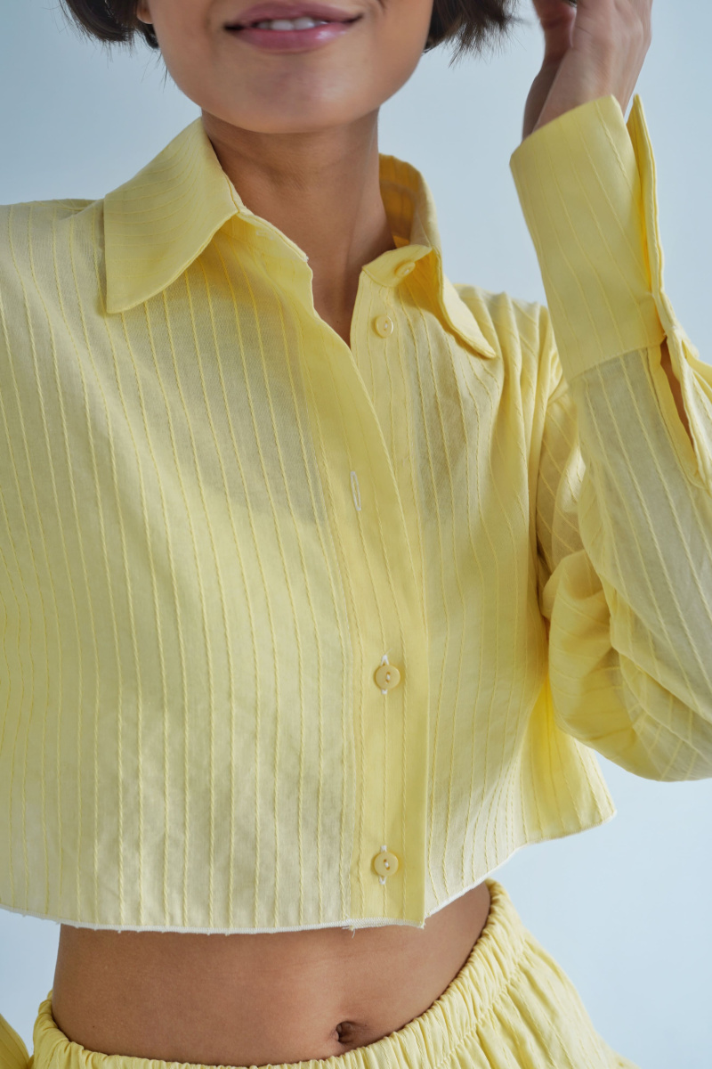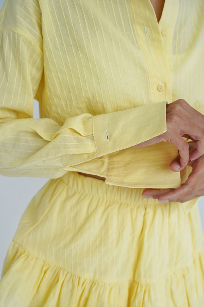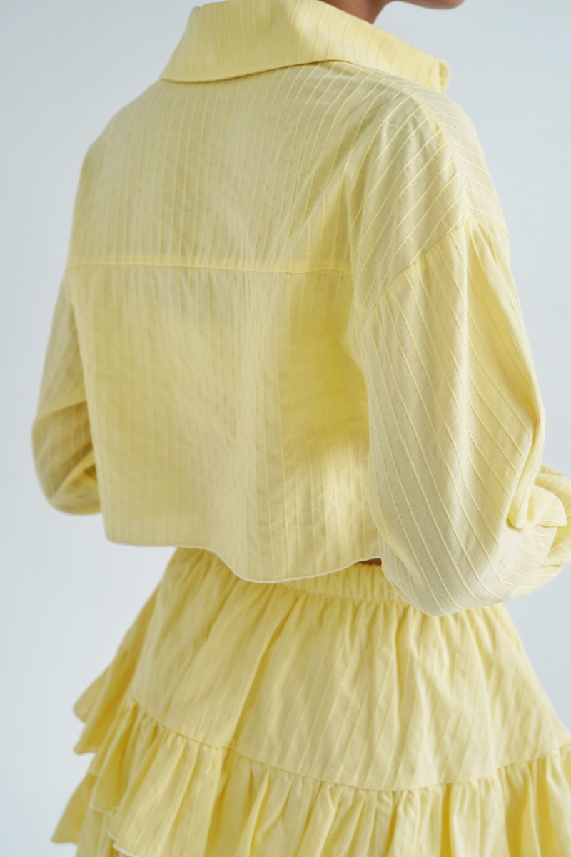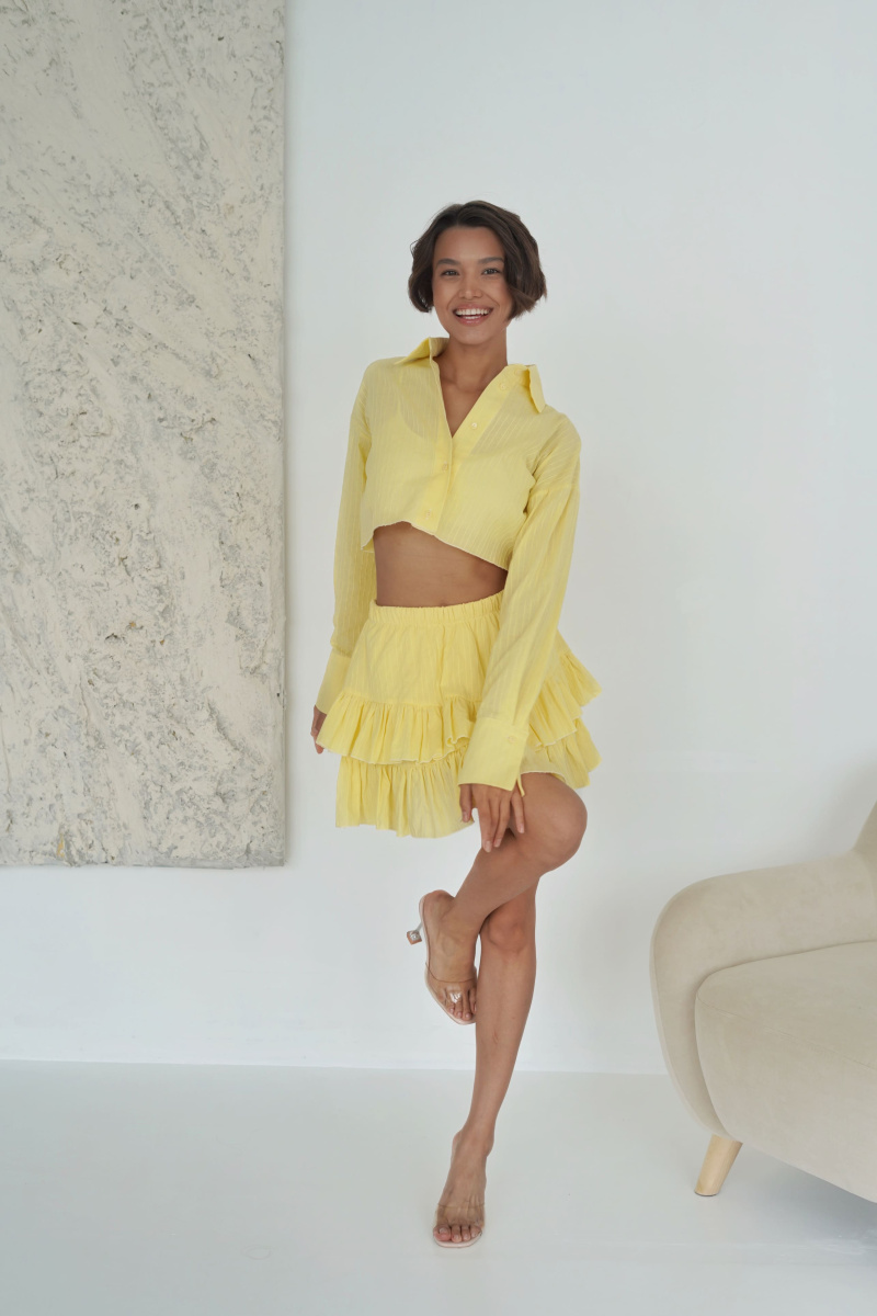 Юбка-шорты в длине мини на высокой посадке с отстроченной резинкой, выполнена из нескольких слоев фактурной ткани в полоску с рюшами, что придает пышности.