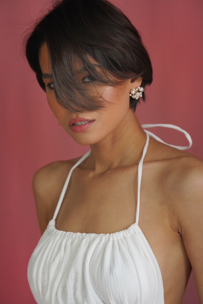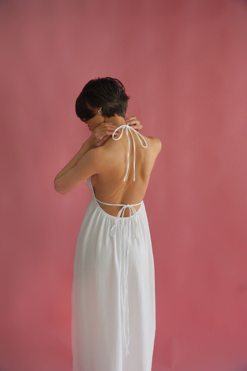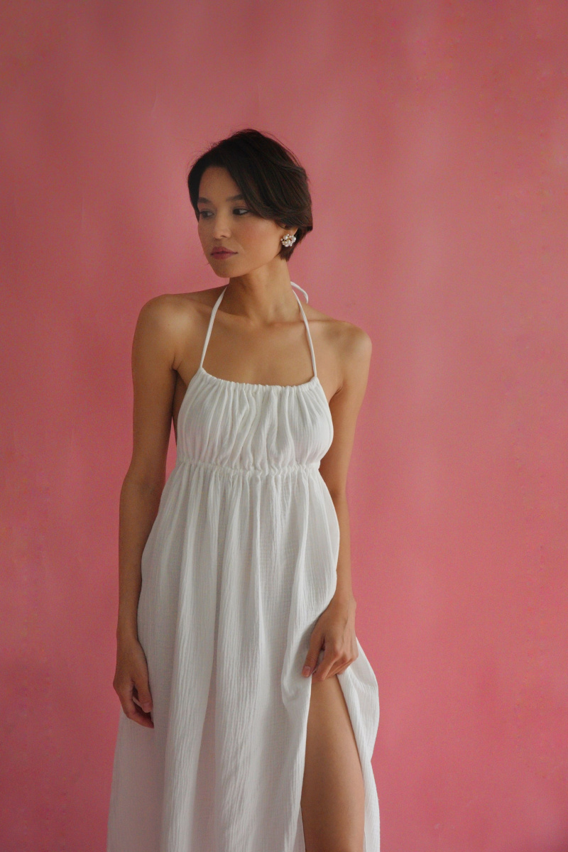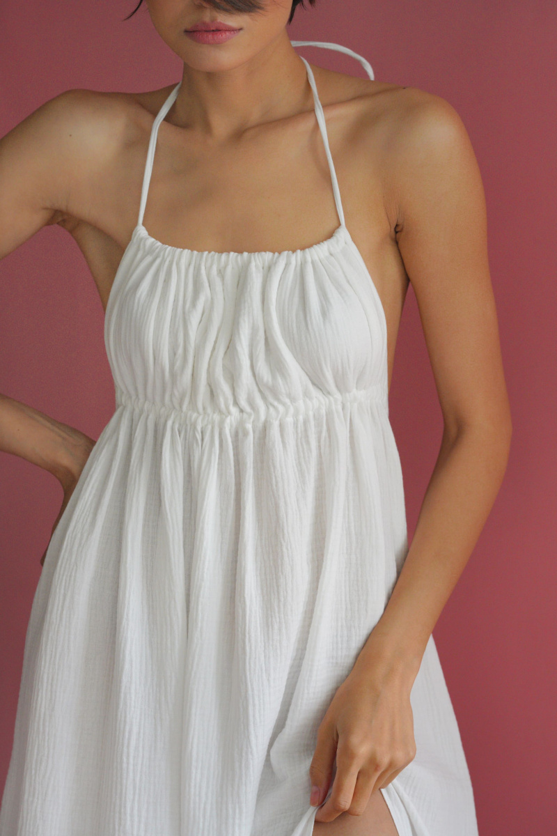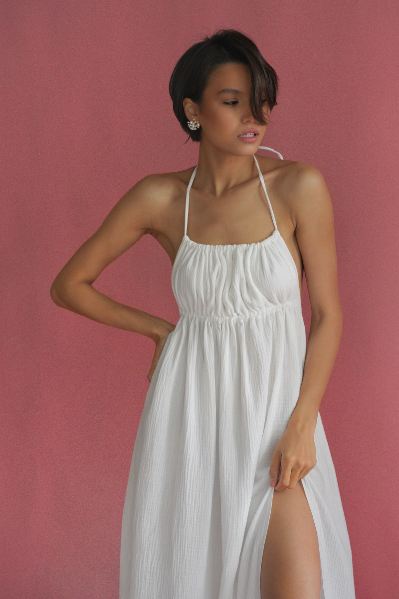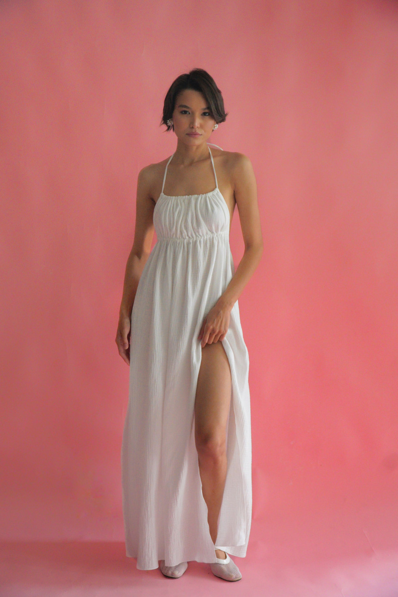 Сарафан в длине макси из легкого и воздушного муслина, с открытой спинкой на завязках, со сборкой по груди, а также с разрезом по передней части.