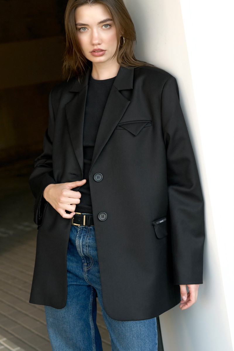 Жакет Base Oversize в черном цвете с платочком. Классический вариант на все случаи жизни. Не меняет форму после стирки/химчистки.