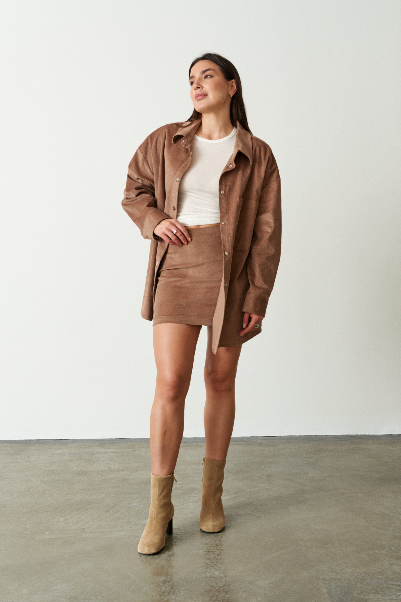 Минималистичная юбка силуэта легкая трапеция – универсальная база в гардеробе. Выполнена из плотного мягкого штрокса в мелкий рубчик. Выточки сзади подчеркивают идеальную посадку. Модель застёгивается на потайную молнию по спинке.